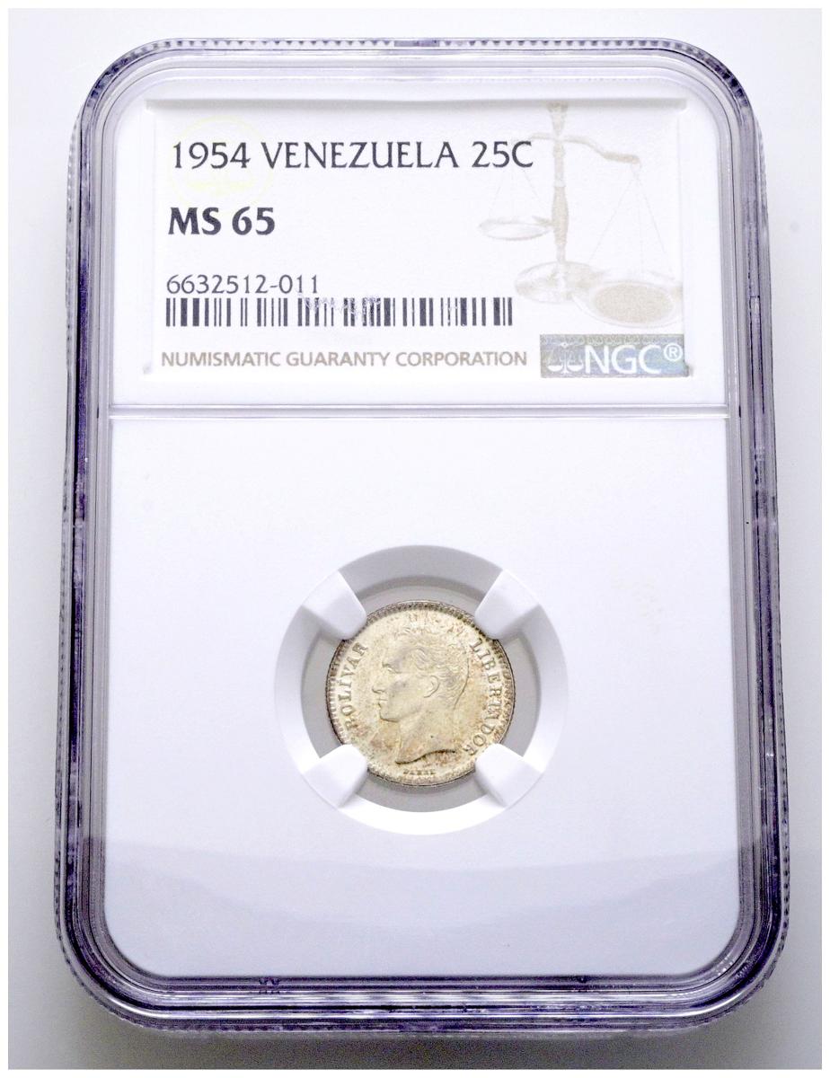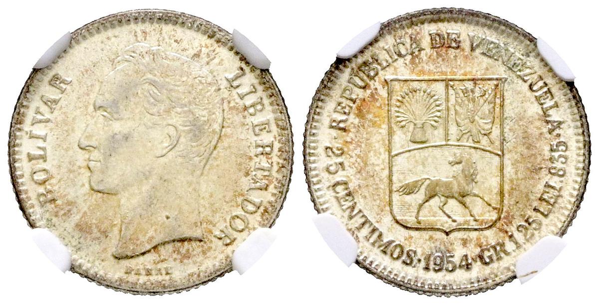 VENEZUELA. 25 Céntimos. (Ar. 1,25g/16mm)*. 1954. Philadelphia. (Km#35). Encapsulada por NGC MS 65. *Peso y medidas teóricos.