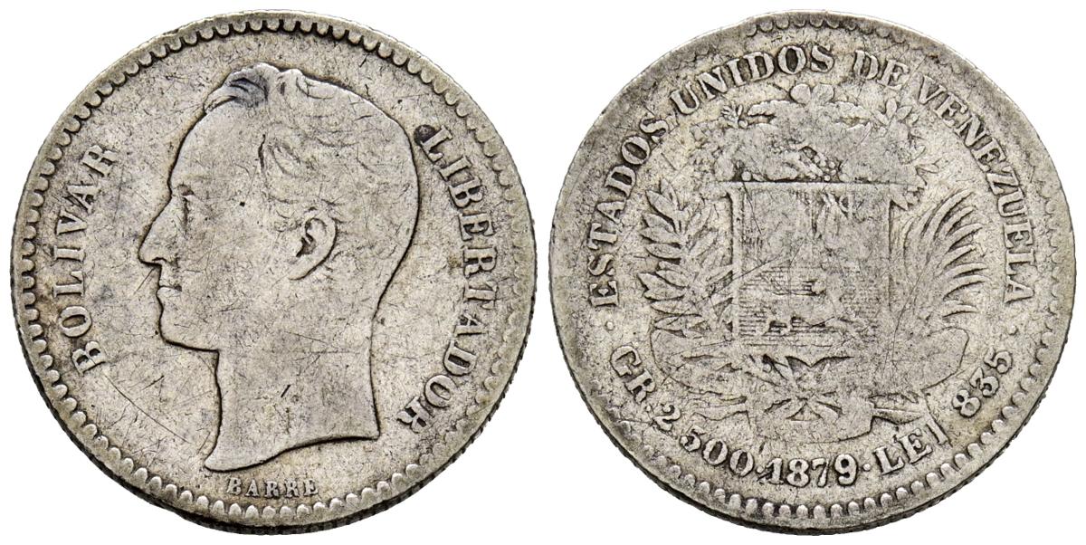 VENEZUELA. 50 Céntimos. (Ar. 2,50g/18mm). 1879. Bruselas. (Km#21). MBC-.