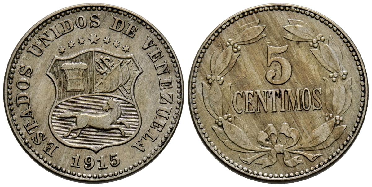 VENEZUELA. 5 Céntimos. (CuNi. 2,38g/19mm). 1915 (Primer año de emisión). Philadelphia. (Km#27). MBC+. Escasa.