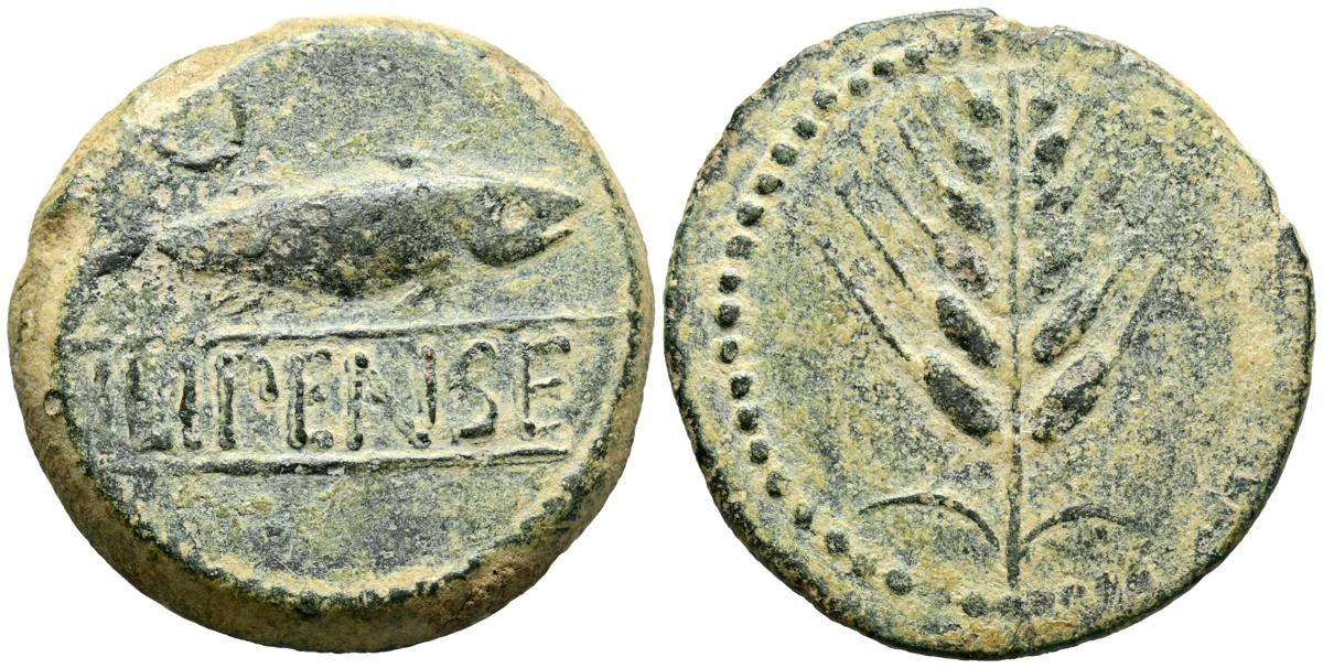 ILIPENSE (Alcalá del Río, Sevilla). As. (Ae. 15,11g/30mm). 120-20 a.C. (FAB-1531). Anv: Sábalo a derecha, debajo leyenda dentro de cartela: ILIPENSE. Rev: Espiga. MBC.