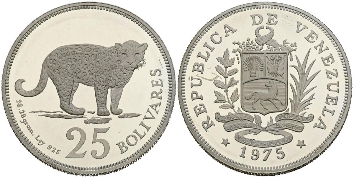 VENEZUELA. 25 Bolívares. (Ar. 28,96g/39mm). 1975. Londres. Jaguar. (Km#46). PROOF.