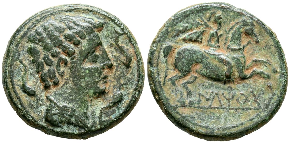 ILTIRTA (Lérida). As. (Ae. 12,61g/27mm). 200-20 a.C. (FAB-1465). Anv: Cabeza masculina a derecha, alrededor tres delfines. Rev: Jinete con palma a derecha, debajo leyenda ibérica: ILTRiRTa. MBC.