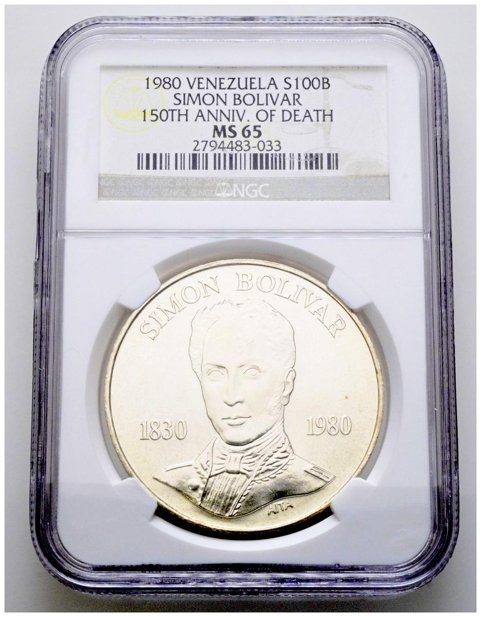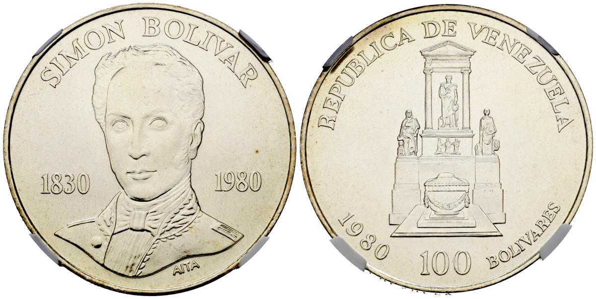 VENEZUELA. 100 Bolívares. (Ar. 22,00g/40mm)*. 1980. Londres. 150 Aniversario de la muerta de Simón Bolivar. (Km#56). Encapsulada por NGC MS 65. *Peso y medidas teóricos.
