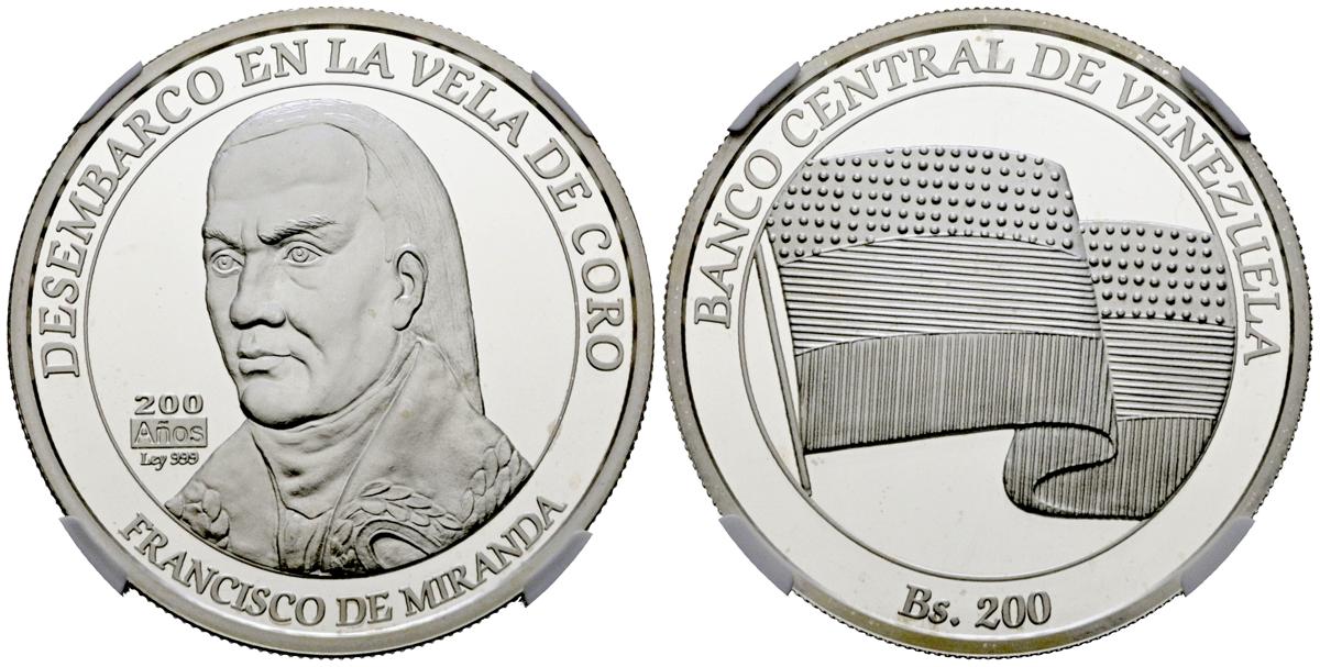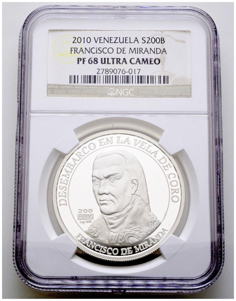 VENEZUELA. 200 Bolívares. (Ar. 31,10g/39mm)*. 2010. Suiza. Francisco de Miranda. (Km#97). Encapsulada por NGC PF 68 Ultra Cameo. *Peso y medida teóricos.