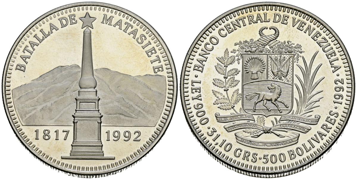 VENEZUELA. 500 Bolívares. (Ar. 31,17g/35mm). 1992. Batalla de Matasiete (1817-1992). PROOF.