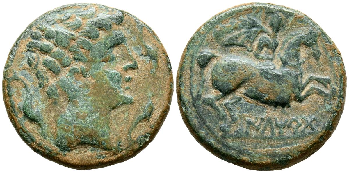 ILTIRTA (Lérida). As. (Ae. 11,94g/27mm). 200-20 a.C. (FAB-1465). Anv: Cabeza masculina a derecha, alrededor tres delfines. Rev: Jinete con palma a derecha, debajo leyenda ibérica: ILTRiRTa. MBC.