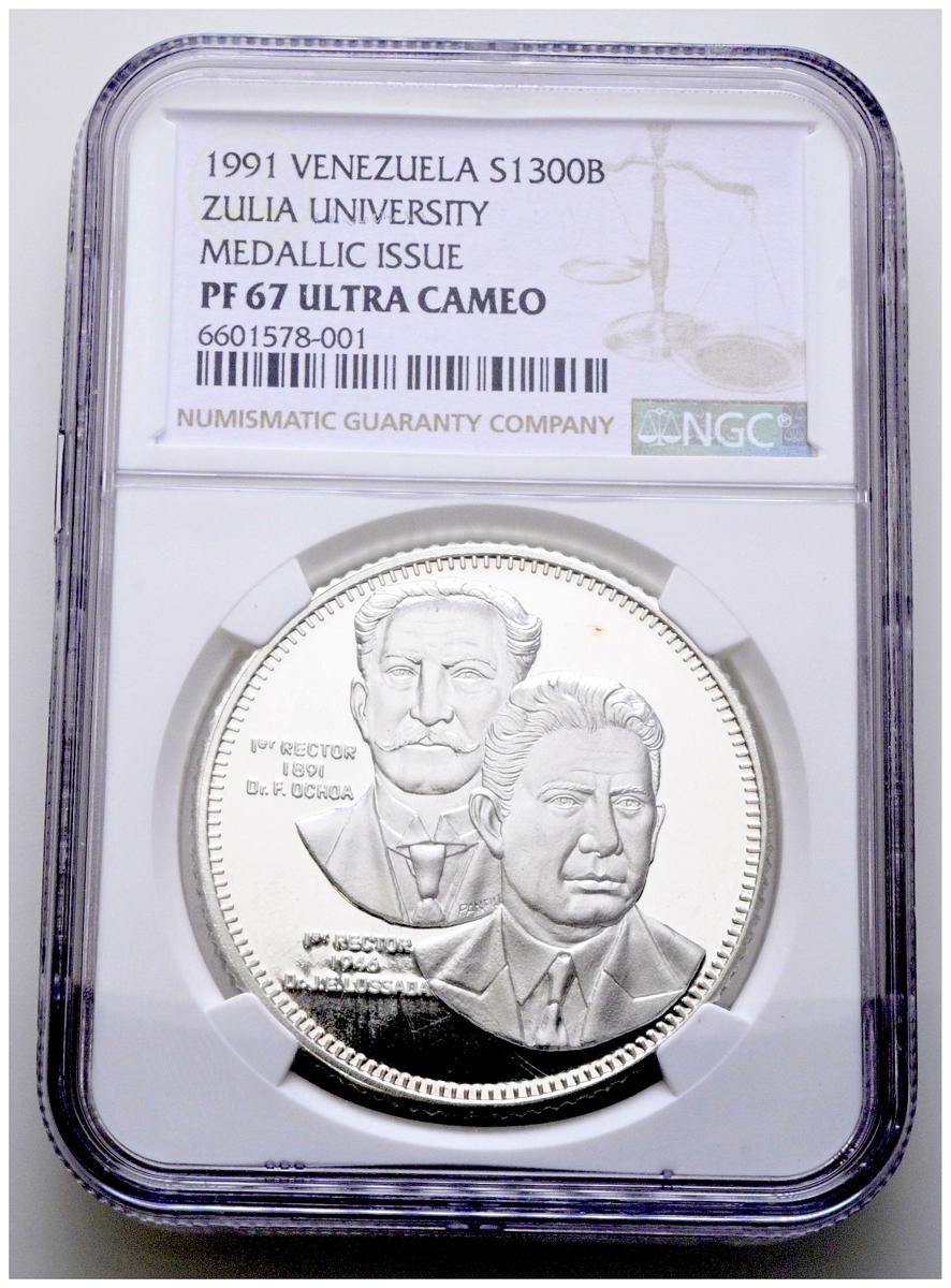 VENEZUELA. 1300 Bolívares. (Ar. 40,00g/40mm)*. 1991. Centenario de la creación de la Universidad de Zulia. (KmY#1). Encapsulada por NGC PF 67 Ultra Cameo. Sólo 1.500 unidades acuñadas. *Peso y medida teóricos.