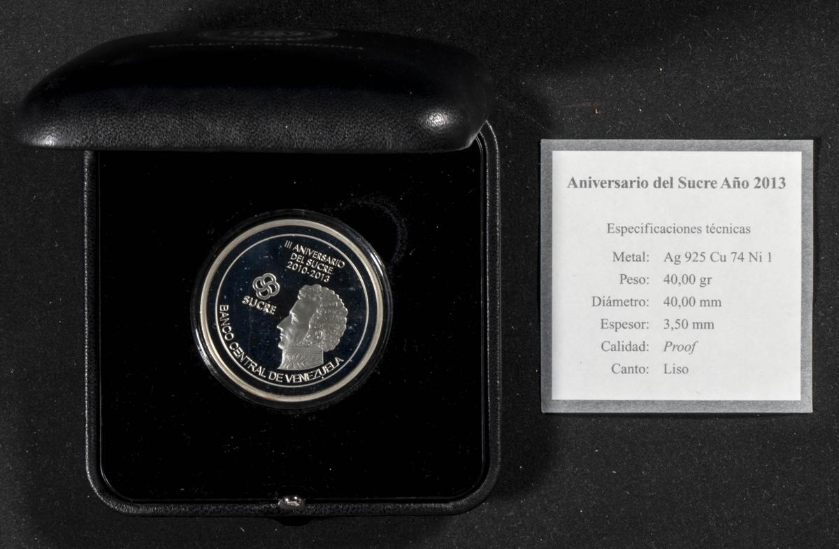 VENEZUELA. Medalla conmemorativa del III Aniversario del Sucre. (Ar. 40,00g/40mm). 2013. Banco Central de Venezuela. PROOF. Incluye estuche oficial.