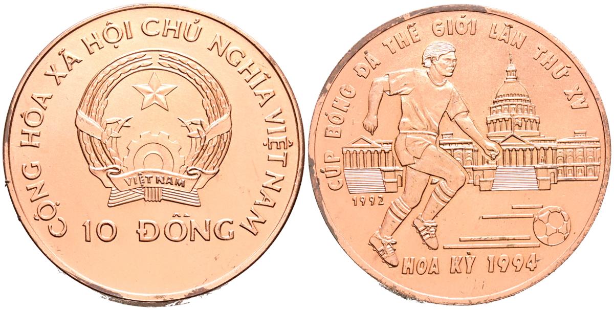 VIETNAM. 10 Dong (Ae. 29,77g/38mm). 1992. Mundial de Fútbol USA´94. (Km#46). SC.