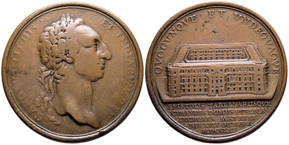CARLOS III (1759-1788). Inauguración de la Sede de Correos (Ae. 22,64g)38mm). 1761. Grabador: Prieto. (V. 43). MBC-.