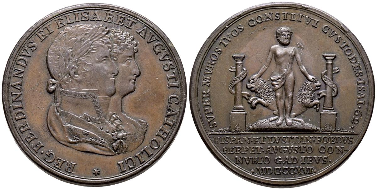 FERNANDO VII (1808-1833). Enlace Fernando VII y María Isabel de Braganza (Ae. 19,86g/34mm). 1816. Cádiz. (V.324). EBC-. Ligeras rayitas.