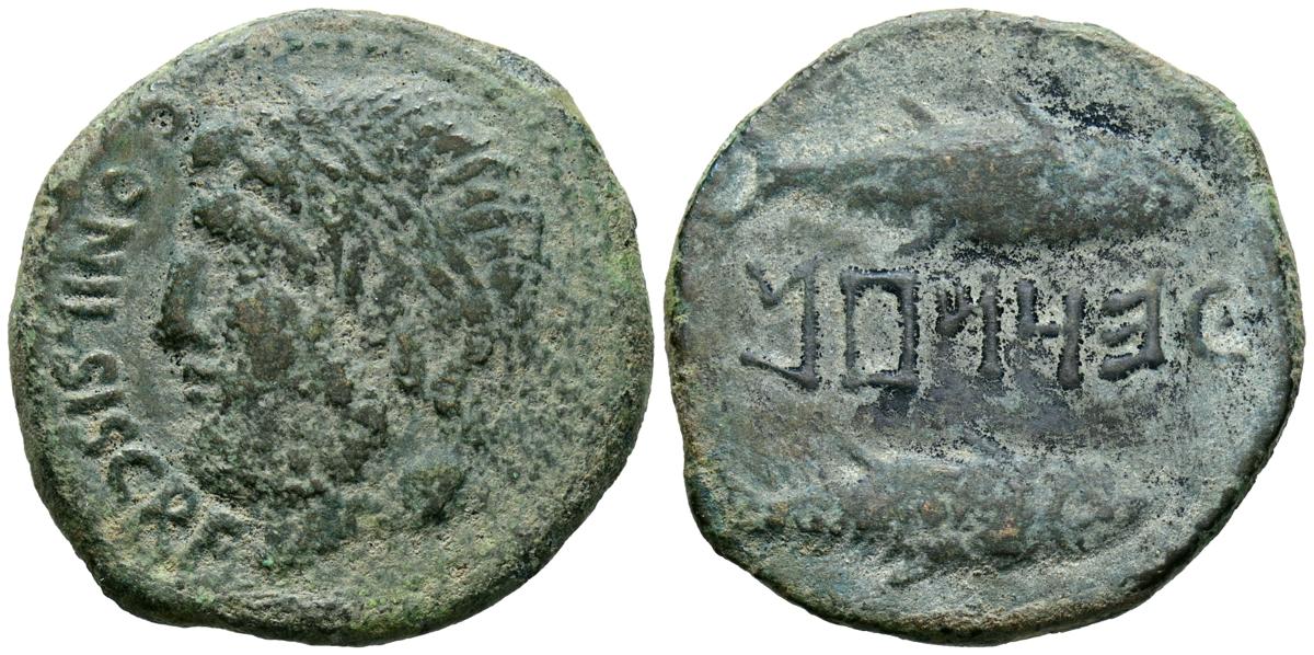 KETOVION (Alcácer do Sal, Portugal). As. (Ae. 10,45g/29mm). 150-50 a.C. (FAB-1632). Anv: Cabeza laureada y barbada masculina a derecha, delante leyenda: CAND NIL SISCR F. Rev: Dos atunes a derecha, entre ellos leyenda púnica: KeToVION. MBC-. Raro ejemplar.