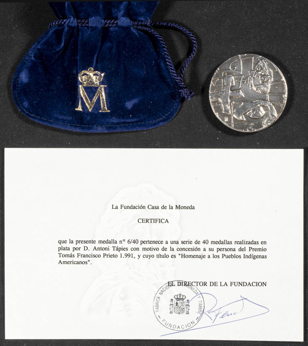 ESPAÑA. Antoni Tápies. "Homenaje a los Pueblos Indígenas Americanos" (Ar. 100,61g/55mm). Premio Tomás Francisco Prieto. 1991. Fundación Casa de la Moneda. Tirada de sólo 40 unidades (6/40). Incluye certificado de autenticidad y estuche original de terciopelo. Muy escasa.