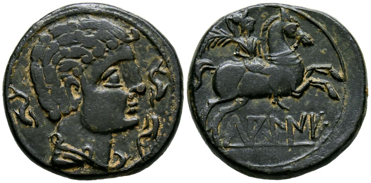 LAGINE (Zona de Aragón). As. (Ae. 9,62g/25mm). 120-20 a.C. (FAB-1656). Anv: Cabeza masculina con adornos a derecha, alrededor tres delfines. Rev: Jinete con palma a derecha, debajo leyenda ibérica sobre línea: LAGiNE. MBC+. Escaso y bonito ejemplar.