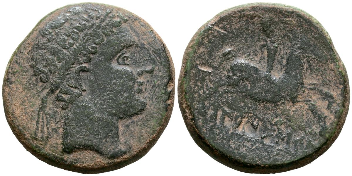 LAIESCEN (Barcelona). As. (Ae. 18,13g/30mm). 220-200 a.C. (FAB-1660). Anv: Cabeza masculina laureada a derecha. Rev: Jinete con palma a derecha, debajo leyenda: LAIESCeN. MBC-.