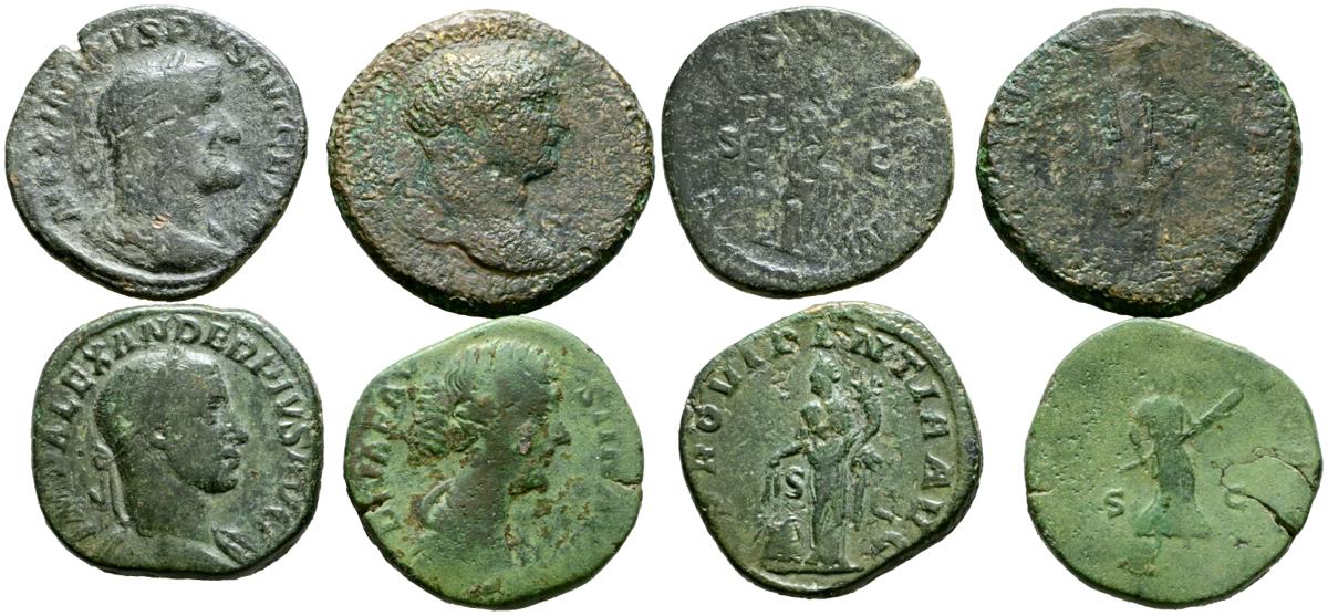 IMPERIO ROMANO. Interesante conjunto de 4 Sestercios acuñados en los periodos de Trajano, Faustina II, Alejandro Severo y Maximino I. Diferentes estados de conservación. A EXAMINAR
