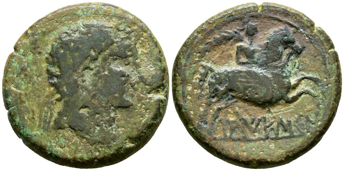 LAIESCEN (Barcelona). As. (Ae. 14,14g/27mm). 220-200 a.C. (FAB-1660). Anv: Cabeza masculina laureada a derecha. Rev: Jinete con palma a derecha, debajo leyenda: LAIESCeN. BC+.