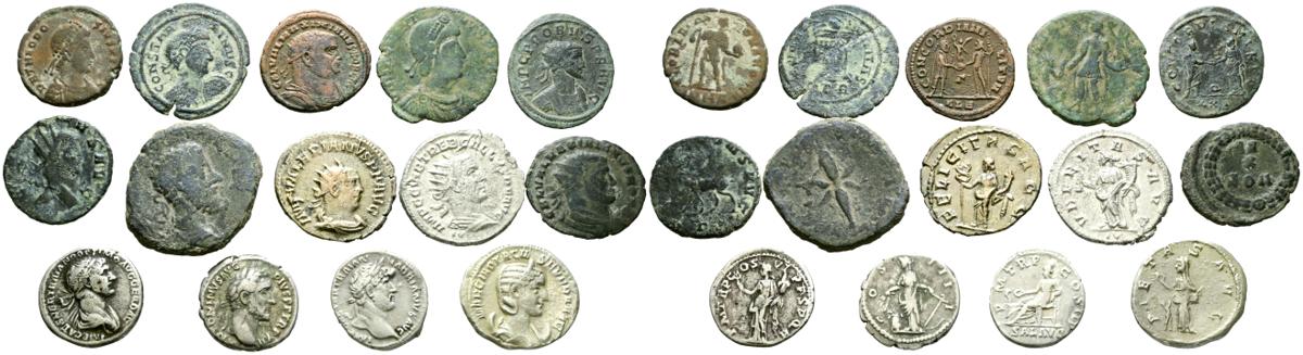 IMPERIO ROMANO. Interesante conjunto de 14 piezas imperiales donde encontramos variedad de módulos y materiales: denarios, antonianos, follis y maiorinas principalmente así como de emperadores representados. Diferentes estados de conservación. A EXAMINAR