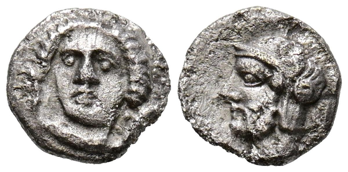 CILICIA, Tarsos. Obolo. (Ar. 0,62g/9mm). 380-373 a.C. Pharnabazos. (SNG Paris 306; SNG Levante 90). Anv: Cabeza femenina de frente entre dos peces. Rev: Cabeza barbada masculina a izquierda con casco. MBC.
