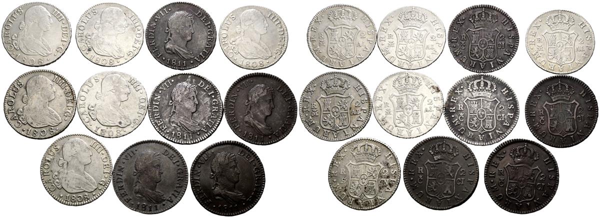 MONARQUÍA ESPAÑOLA. Bonito conjunto de 11 piezas de 2 Reales acuñados bajo los reinados de Carlos IV en 1808 (cecas de Madrid, 5, y Sevilla, 1) y Fernando VII en 1811 (ceca de Cádiz, 5). Diferentes estados de conservación. A EXAMINAR.