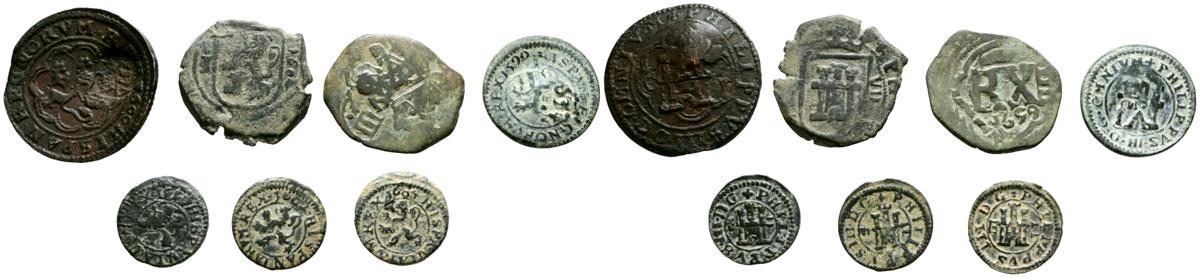 MONARQUÍA ESPAÑOLES. Interesante conjunto de 7 cobres, todos diferentes, acuñados en los reinados de Felipe III y Felipe IV en diversas cecas. Incluye piezas con resellos, alguno escaso. Diferentes estados de conservación. A EXAMINAR