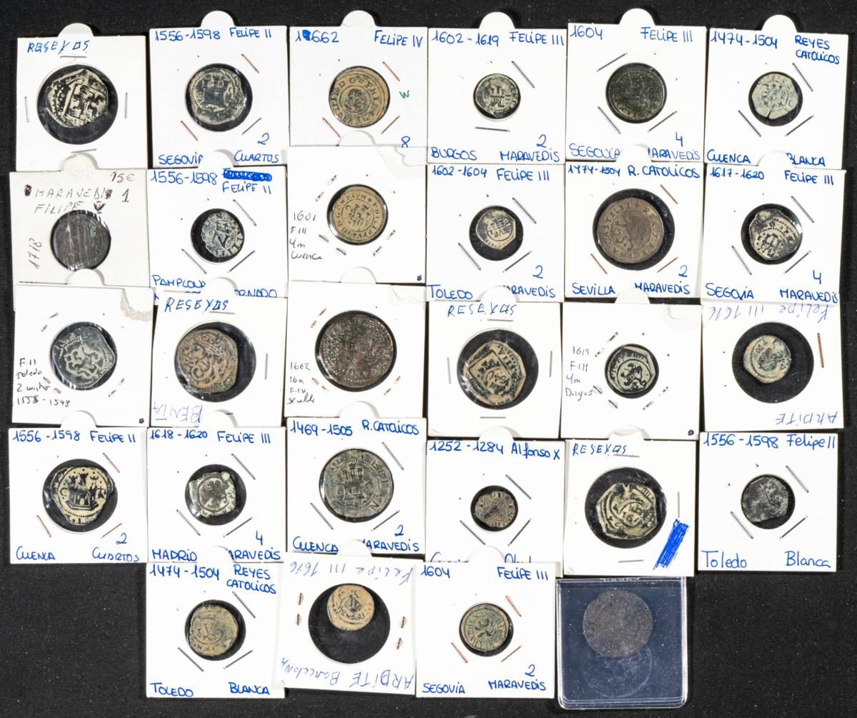 MONARQUÍA ESPAÑOLA. Interesante y variado conjunto formado por 28 cobres acuñados bajo diferentes reinados(desde los RRCC hasta Felipe V) y con una gran variedad de módulos y cecas. Incluye piezas con resellos a clasificar. Diferentes estados de conservación. A EXAMINAR.