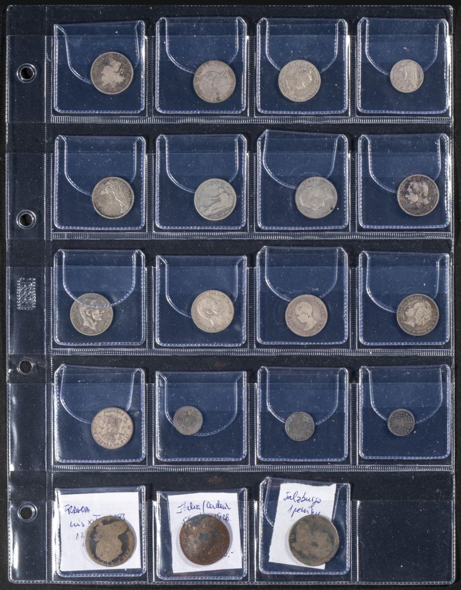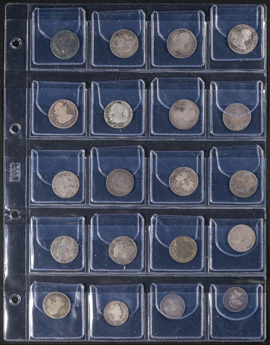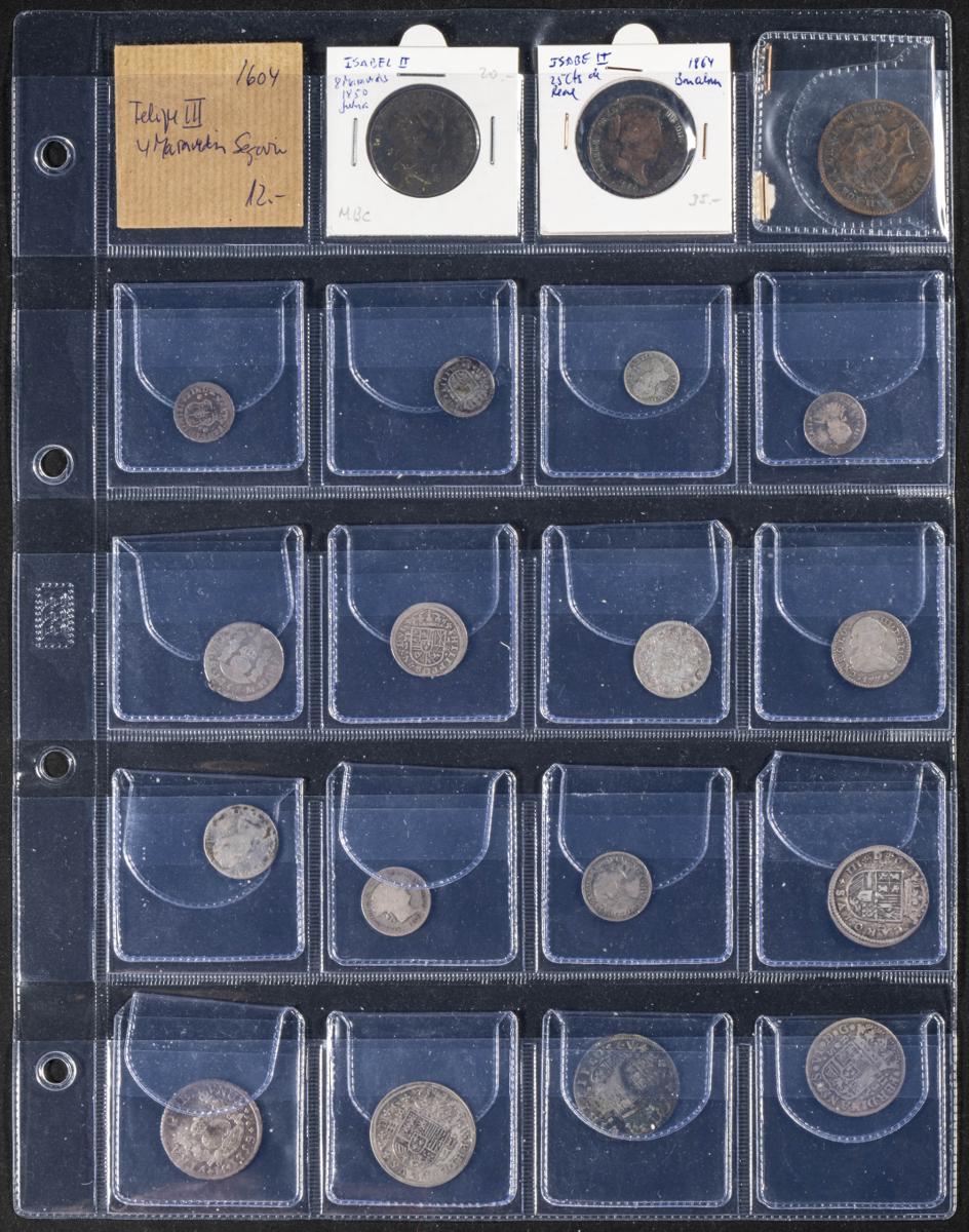 MONARQUÍA ESPAÑOLA Y CENTENARIO DE LA PESETA. Interesante resto de colección formado por 59 piezas, en su gran mayoría, en plata y con acuñaciones comprendidas entre los reinado de Felipe III y Alfonso XIII. La colección está centrada, en general, en módulo pequeño y destaca, por número, las acuñaciones a nombre de Carlos III, Carlos IV e Isabel II. Destacan también piezas columnarias en diferentes módulos e interesantes ejemplares de 2 Reales. El conjunto se completa con alguna pieza extranjera de época. Diferentes estados de conservación. IMPRESCINDIBLE EXAMINAR.