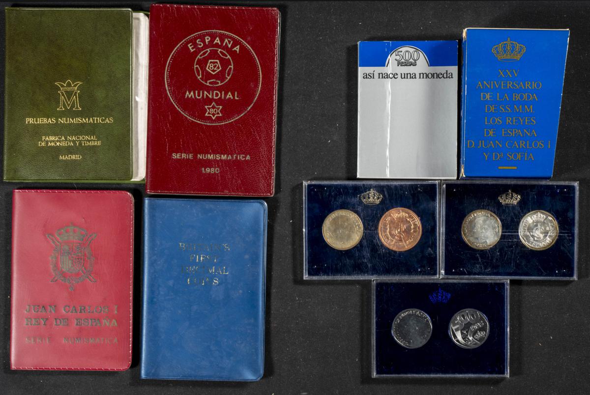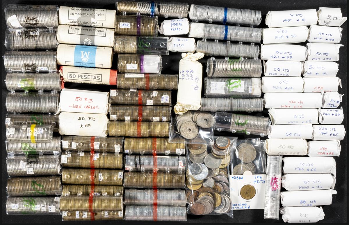 ESTADO ESPAÑOL Y JUAN CARLOS I. Extenso lote compuesto fundamentalmente por decenas de cartuchos de ambos periodos con una gran variedad de módulos y valores. El conjunto incluye varias carteras, el set de 500 Pesetas en Pruebas de la FNMT así como una pequeña representación de moneda extranjeras. Diferentes estados de conservación.