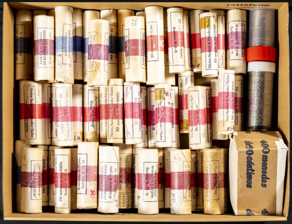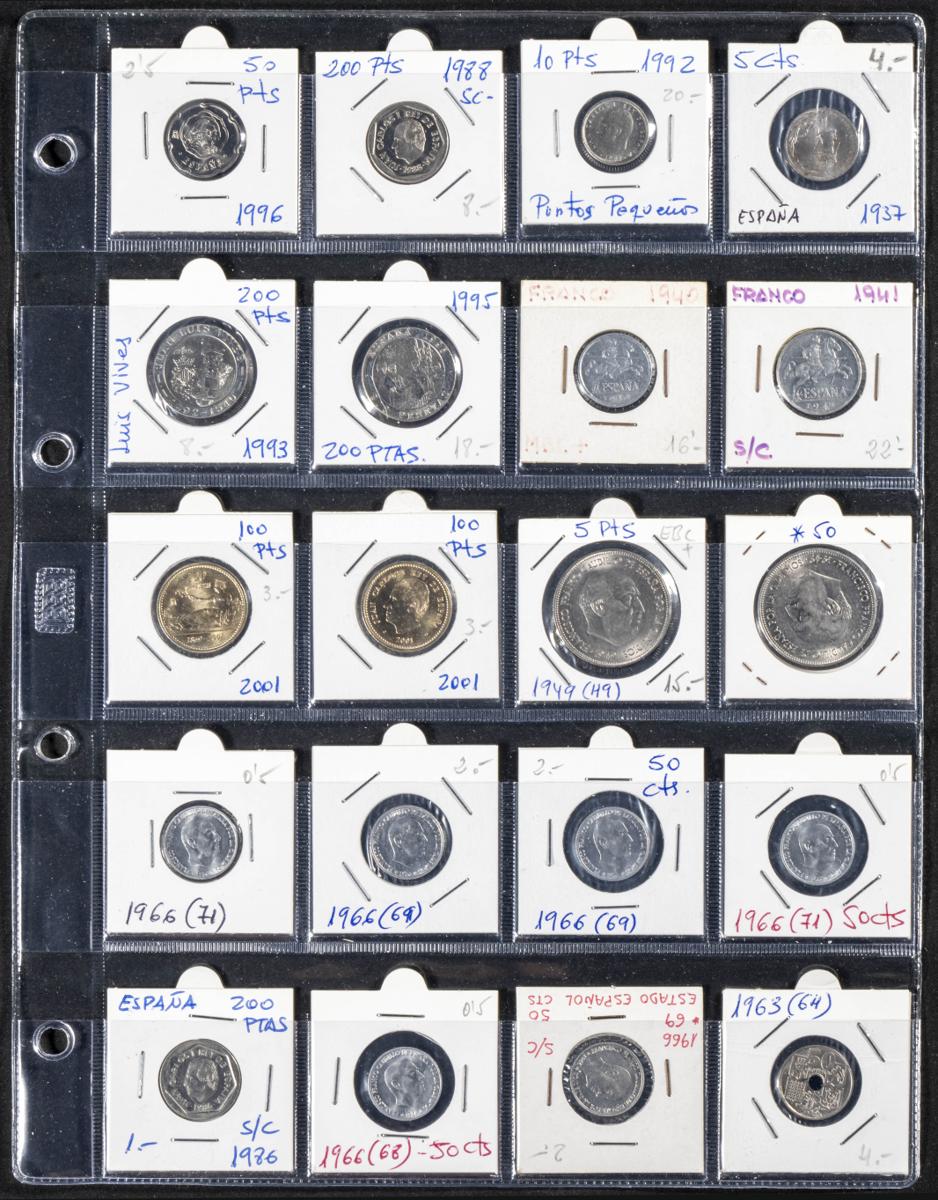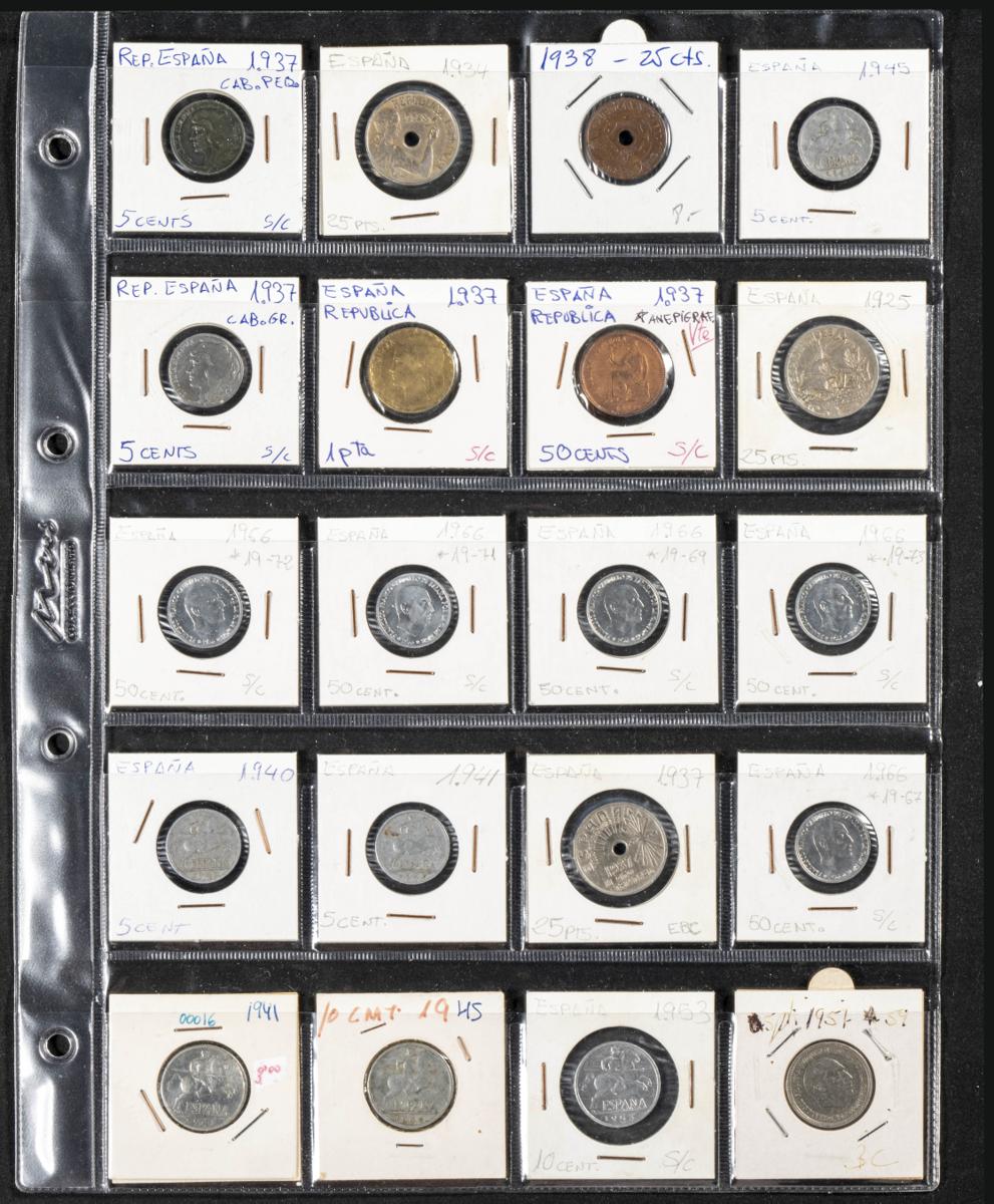 ESPAÑA. Extensa e interesante colección de centenares de monedas españolas centrada fundamentalmente en el Estado Español y Juan Carlos I (aunque contiene también piezas de la II República). La colección se presenta tanto en hojas como en cartuchos oficiales (alrededor de 60) con una gran variedad de módulos, valores y fechas. El conjunto incluye una caja de la FNMT con 400 monedas de 50 céntimos del Estado Español. Diferentes estados de conservación. A EXAMINAR.