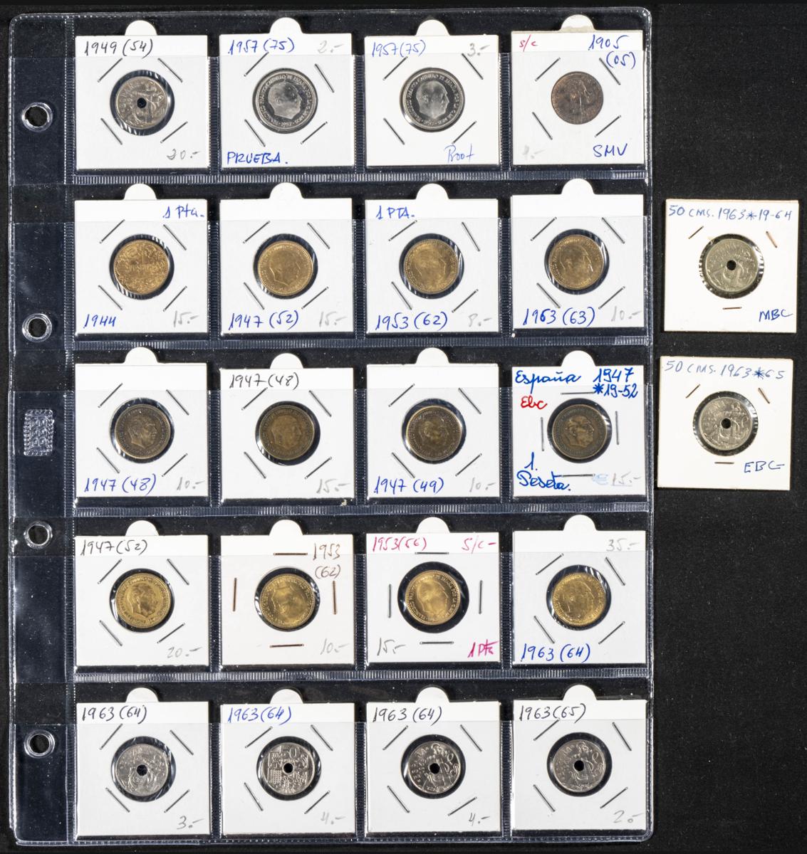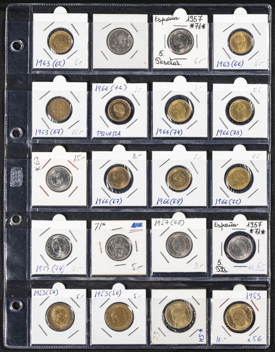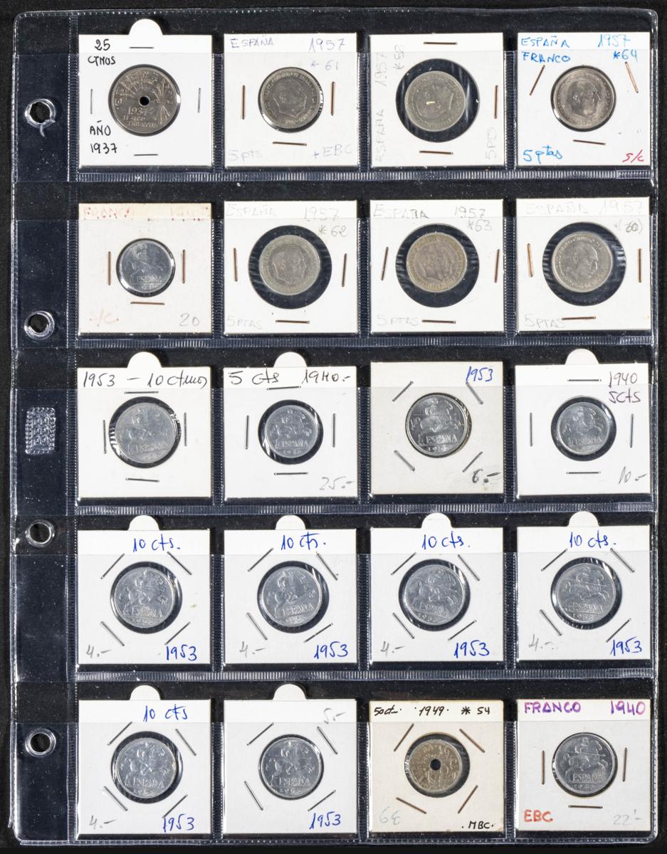 ESPAÑA. Extensa e interesante colección de centenares de monedas españolas centrada fundamentalmente en el Estado Español y Juan Carlos I (aunque contiene también piezas de la II República). La colección se presenta tanto en hojas como en cartuchos oficiales (alrededor de 60) con una gran variedad de módulos, valores y fechas. El conjunto incluye una caja de la FNMT con 400 monedas de 50 céntimos del Estado Español. Diferentes estados de conservación. A EXAMINAR.