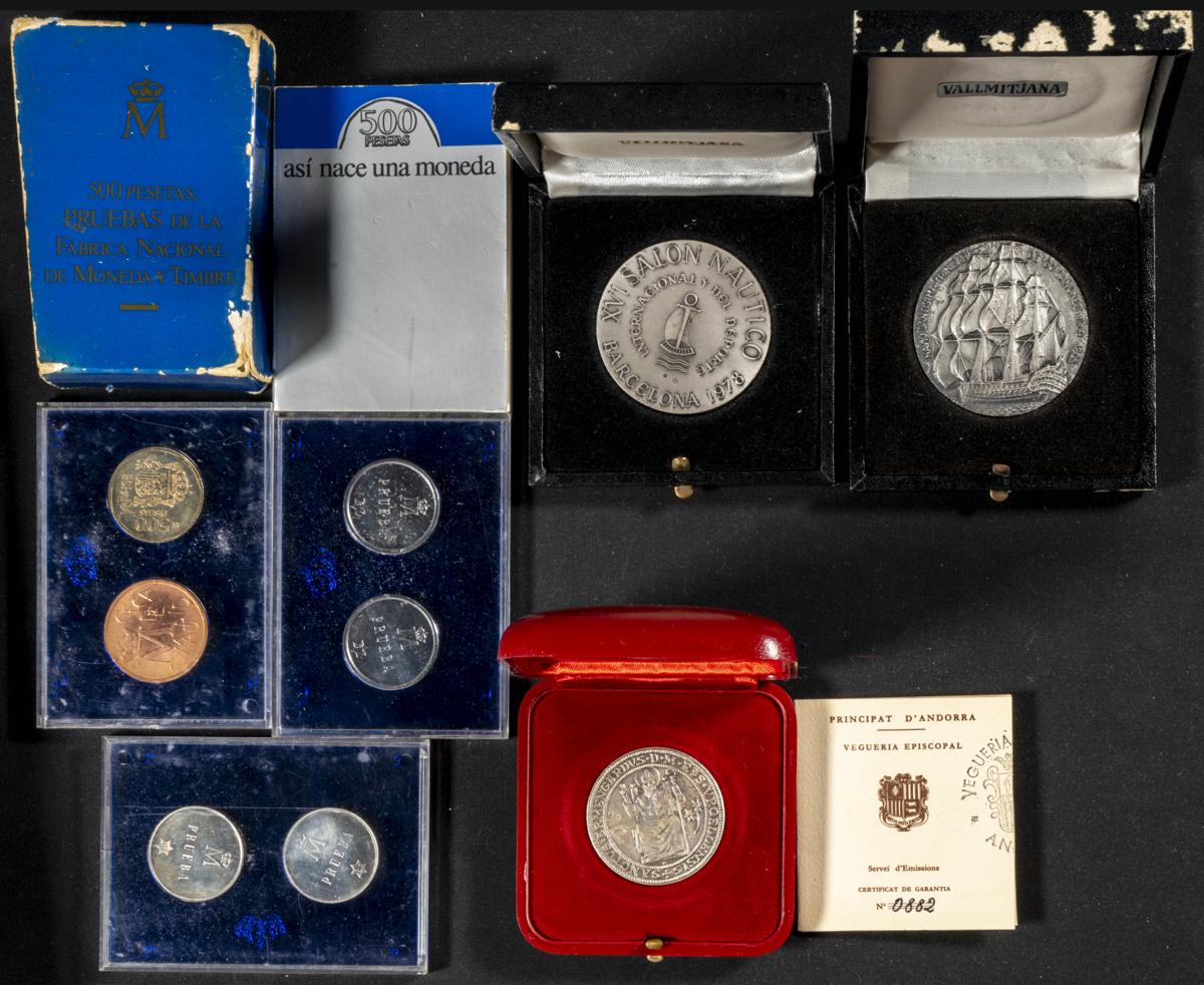 MEDALLAS. Bonito conjunto de 6 sets de medallas (5 de España y 1 de Andorra). Distribuyéndose así: 2 piezas conmemorativas del Salón Náutico de Barcelona (1977 y 1978) 1 estuche "Así Nace Una Peseta" y 2 sets del Bicentenario de Carlos III acuñados por la FNMT. El conjunto se completa con 1 medalla en plata de Sant Ermengol de Andorra (1977).Excelente nivel de conservación de las piezas. A EXAMINAR.