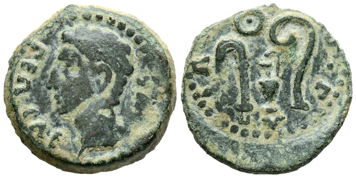 COLONIA PATRICIA (Córdoba). Cuadrante. (Ae. 2,25g/16mm). 27 a.C.-14 d.C. (FAB-1993). Anv: Cabeza de Augusto a izquierda, alrededor leyenda: PER CAE AVG. Rev: Aspérgilo, preferículo, lítuo y patera, alrededor leyenda: COLO PATR. MBC.