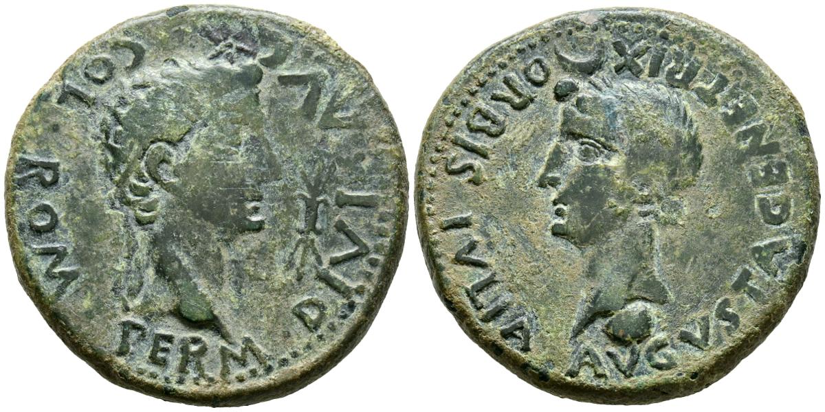 COLONIA ROMULA (Sevilla). Dupondio. (Ae. 26,60g/34mm). 14-36 d.C. (FAB-2014). Anv: Cabeza radiada de Augusto a derecha, delante fulmen, alrededor: PERM DIVI AVG COL ROM. Rev: Cabeza de Livia a izquierda, debajo globo, encima creciente, alrededor: IVLIA AVGVSTA GENETRIX ORBIS. MBC.