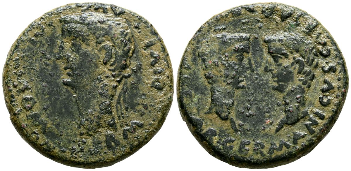 COLONIA ROMULA (Sevilla). As. (Ae. 14,39g/28mm). 27 a.C.-14 d.C. (FAB-2016). Anv: Cabeza laureada de Tiberio a izquierda, alrededor leyenda: PERM DIVI AVG COL ROM. Rev: Cabezas de Germánico y Druso enfrentadas, alrededor leyenda: CAESAR GERMANICVS CAESAR DRVSVS. MBC-.