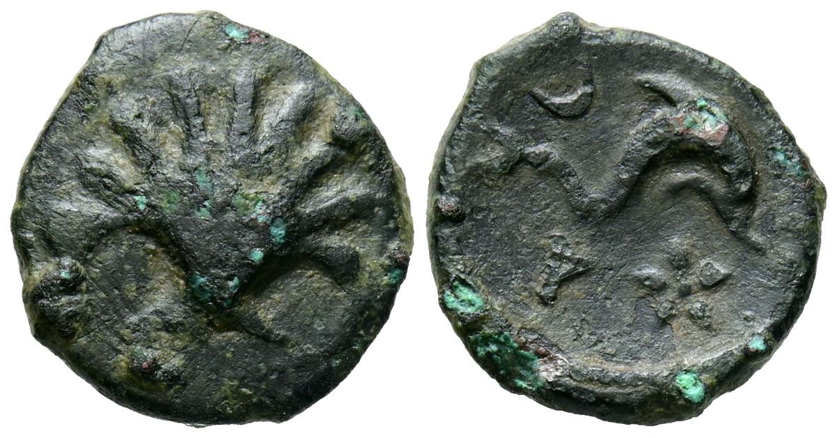 ARSE-SAGUNTO (Sagunto, Valencia). Sextante. (Ae. 1,72g/13mm). 170-20 a.C. (FAB-2064). Anv: Concha. Rev: Delfín a derecha, encima creciente, debajo letra ibérica A y estrella. MBC.