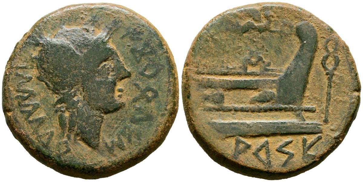 ARSE-SAGUNTO (Sagunto, Valencia). As. (Ae. 20,58g/31mm). 50-20 a.C. (FAB-2076). Anv: Cabeza galeada de Roma a derecha, alrededor leyenda ibérica: ICoRBeLES BaLCaCaLDuR. Rev: Proa a derecha, encima Victoria con corona de laurel a derecha, delante caduceo, debajo leyenda ibérica: ARSE. MBC.