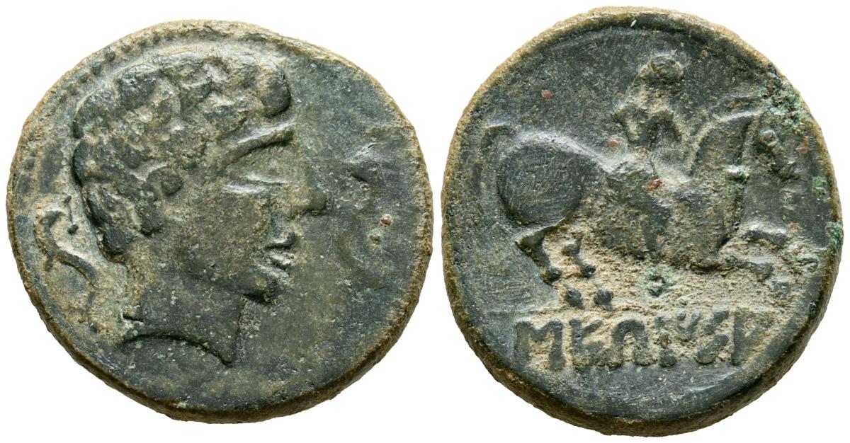 SECAISA (Segeda, Zaragoza). As. (Ae. 8,38g/25mm). 120-20 a.C. (FAB-2131). Anv: Cabeza masculina a derecha, entre dos delfines. Rev: Jinete con lanza a derecha, debajo leyenda ibérica: SECaISA. MBC.