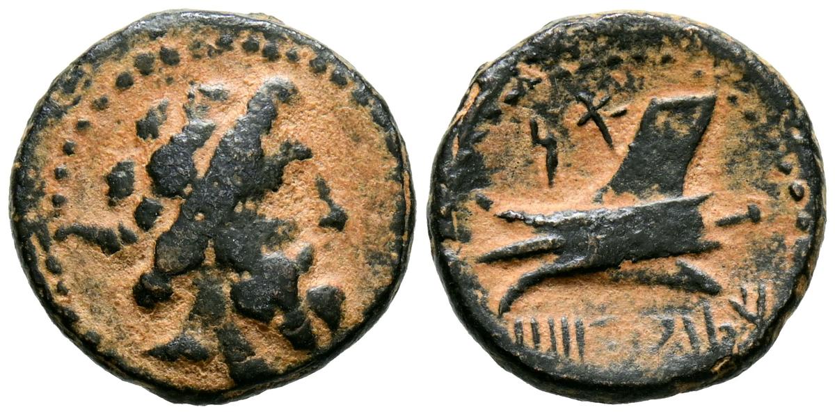 FENICIA, Arados. Ae16. (Ae. 3,02g/16mm). Siglo II a.C. (HGC 10, 88). Anv: Cabeza laureada de Zeus a derecha. Rev: Proa a derecha, alrededor leyenda fenicia. MBC-.