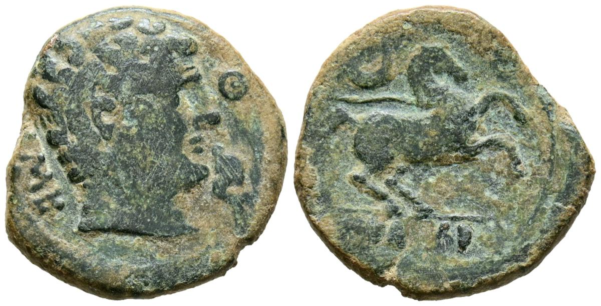 SECAISA (Segeda, Zaragoza). Semis. (Ae. 3,97g/19mm). 120-20 a.C. (FAB-2147). Anv: Cabeza masculina a derecha, detrás letras ibéricas SE, delante letra ibérica Cu y delfín. Rev: Caballo a derecha, encima creciente, debajo leyenda ibérica: SECaISA. MBC-.