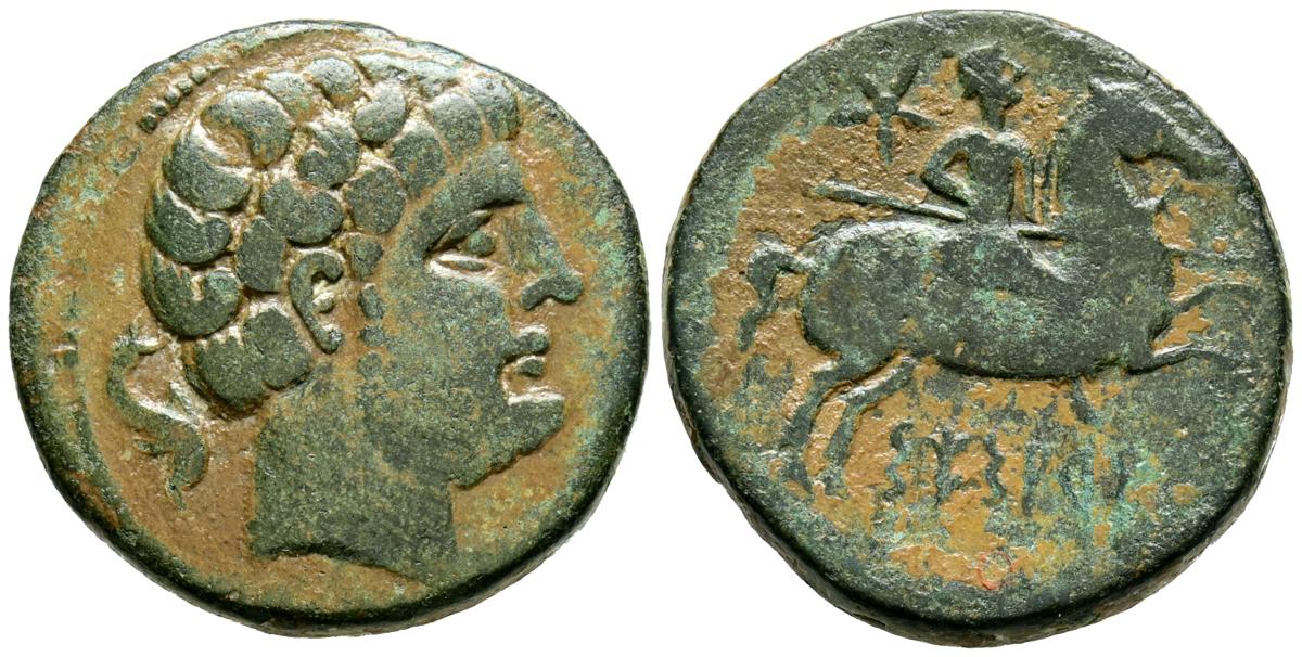SESARS (Zona de Aragón). As. (Ae. 9,03g/24mm). 120-20 a.C. (FAB-2199). Anv: Cabeza masculina barbada a derecha, detrás delfín. Rev: Jinete con lanza a derecha, encima estrella, debajo leyenda ibérica: SESARS. MBC-.