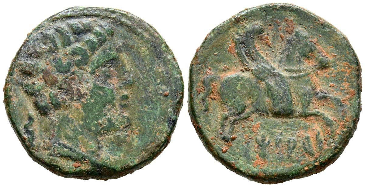 SESARS (Sesa, Huesca). Semis. (Ae. 6,75g/21mm). 120-20 a.C. (FAB-2200). Anv: Cabeza masculina a derecha, detrás letra ibérica: S. Rev: Pegaso a derecha, debajo leyenda ibérica: SESARS. MBC-. Limpiado.