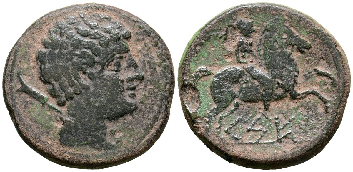 CESE (Tarragona). As. (Ae. 10,70g/26mm). 220-200 a.C. (FAB-2272). Anv: Cabeza masculina a derecha, detrás timón. Rev: Jinete con palma a derecha, debajo leyenda ibérica: CeSE. MBC.