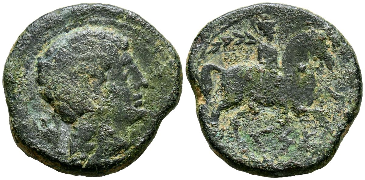 CESE (Tarragona). As. (Ae. 10,55g/26mm). 120-20 a.C. (FAB-2275). Anv: Cabeza masculina a derecha, detrás ánfora. Rev: jinete con palma a derecha, debajo leyenda ibérica: CeSE. MBC-.