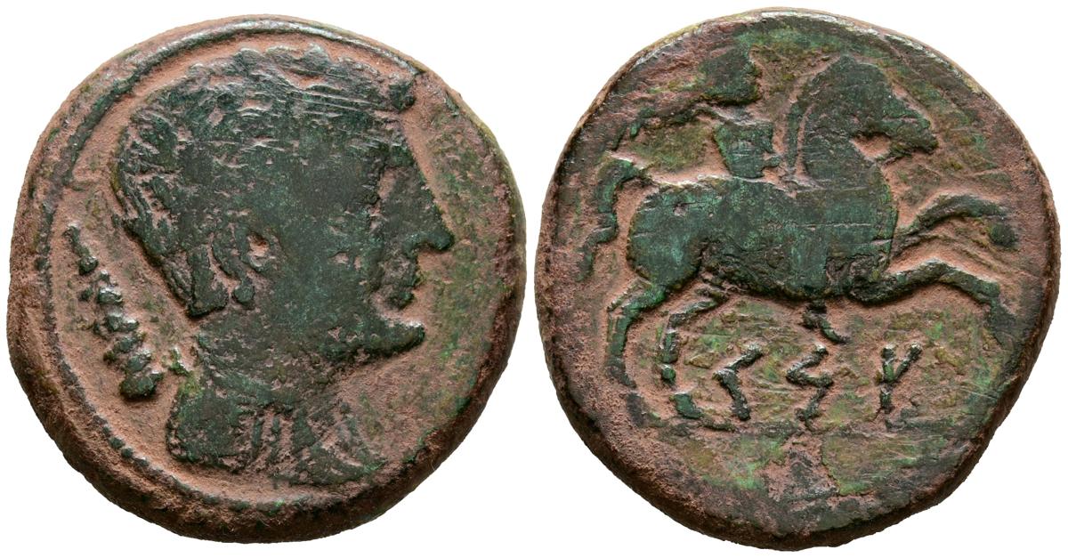 CESE (Tarragona). As. (Ae. 12,93g/27mm). 120-20 a.C. (FAB-2277). Anv: Cabeza masculina a derecha, detrás clava. Rev: Jinete con palma a derecha, debajo leyenda ibérica: CeSE. MBC.