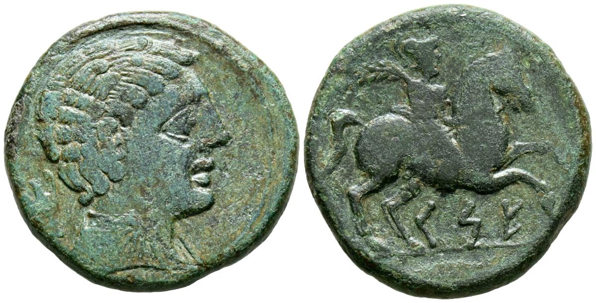 CESE (Tarragona). As. (Ae. 11,22g/26mm). 220-200 a.C. (FAB-2278). Anv: Cabeza masculina a derecha, detrás ánfora. Rev: Jinete con palma a derecha, debajo leyenda ibérica: CeSE. MBC.