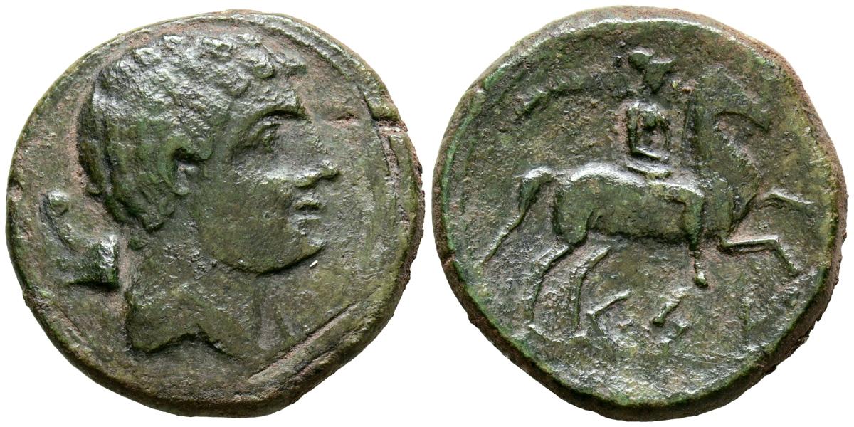 CESE (Tarragona). As. (Ae. 10,77g/26mm). 220-200 a.C. (FAB-2281). Anv: Cabeza masculina a derecha, detrás proa de nave. Rev: Jinete con palma a derecha, debajo leyenda ibérica: CeSE. MBC.