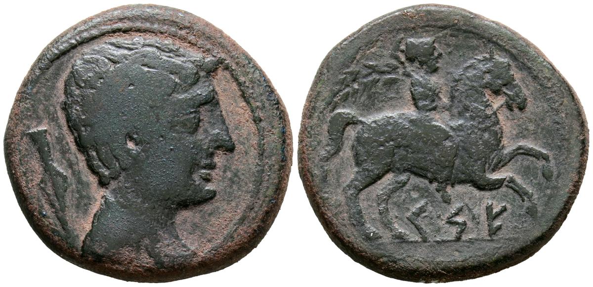 CESE (Tarragona). As. (Ae. 14,57g/26mm). 120-20 a.C. (FAB-2284). Anv: Cabeza masculina a derecha, detrás punta de flecha. Rev: Jinete con palma a derecha, debajo leyenda ibérica: CeSE. MBC-.