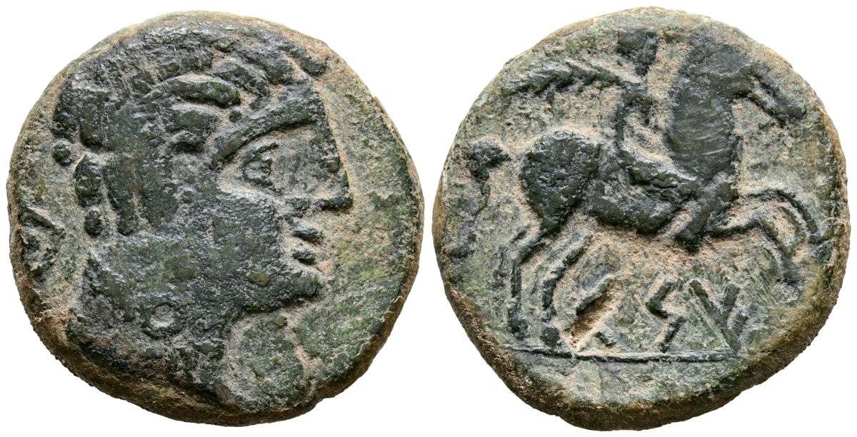 CESE (Tarragona). As. (Ae. 8,92g/22mm). 120-20 a.C. (FAB-2291). Anv: Cabeza masculina a derecha, detrás letra ibérica Du. Rev: Jinete con palma a derecha, debajo leyenda ibérica: CeSE. MBC. Golpe en reverso.