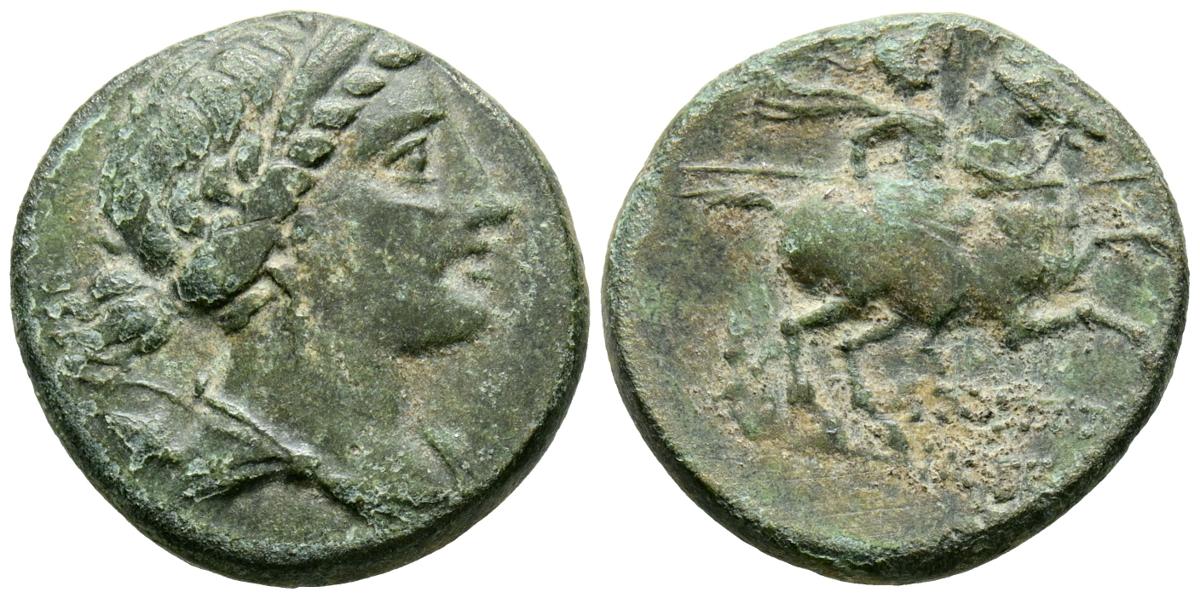 JONIA, Magneisa ad Maeandrum. Ae20. (Ae. 4,61g/20mm). Siglo II-Siglo I a.C. (SNG Copenhagen 846). Anv: Cabeza femenina diademada a derecha. Rev: Guerrero galopando a derecha portando lanza, alrededor leyenda griega. MBC.