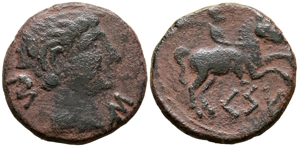 CESE (Tarragona). As. (Ae. 7,57g/2mm). 120-20 a.C. (FAB-2295). Anv: Cabeza masculina a derecha, detrás letras ibéricas: IL, delante S. Rev: Jinete con palma a derecha, debajo leyenda ibérica: CeSE. MBC-.